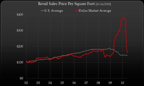 The Dallas-Fort Worth retail sales activites showed increasing sales cap rates climbing to 9.68% when compared to same 2009 period which reflected a 8.05% average sales cap rate. The average price per square foot sale on the 8 DFW Retail buildings aggregating to 352,915 square foot of retail on facilities having a size in excess of 15,000 square feet. These sales averaged $125.61 per square foot compared to the prior quarter when six buildings were sold representing 280,207 square feet at $97.80 per square foot.